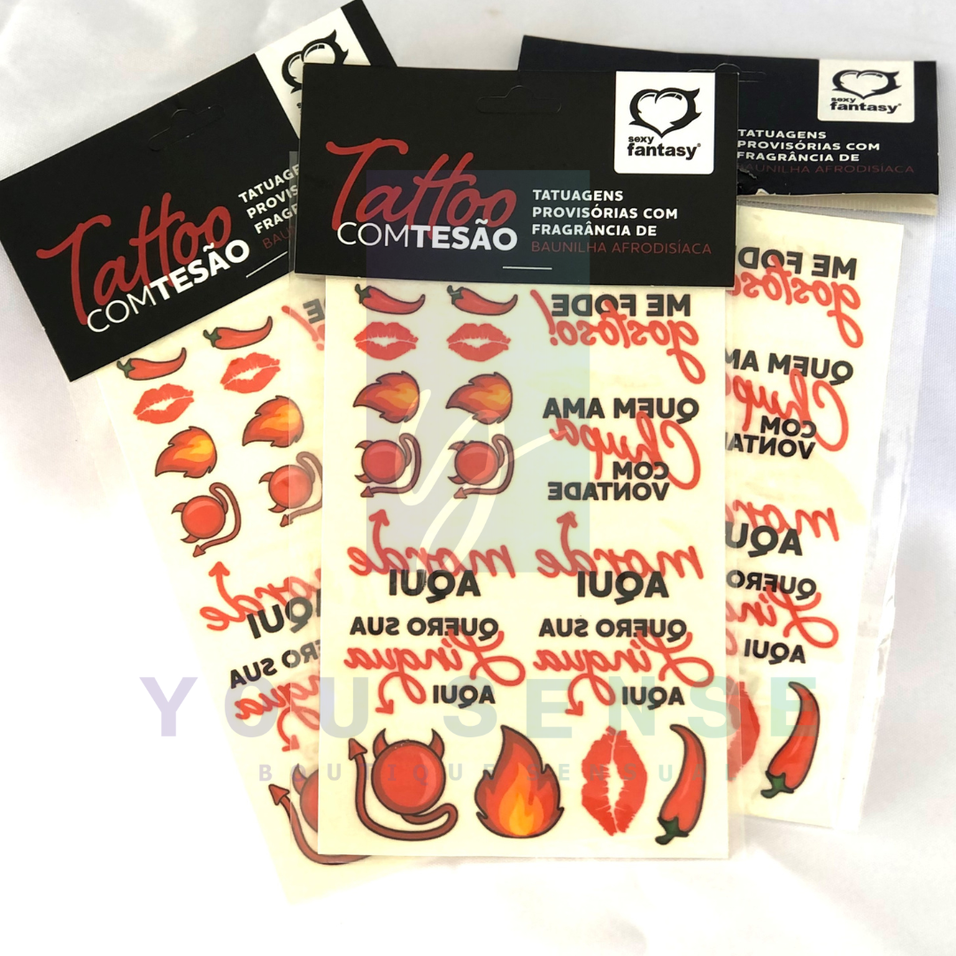 Com frases picantes e desenhos ousados, aplique as tattoos temporárias no corpo com instruções e direcionamentos do que deseja para aquela noite aliando o prazer com muita diversão e ousadia, criando noites quentes e inesquecíveis.
